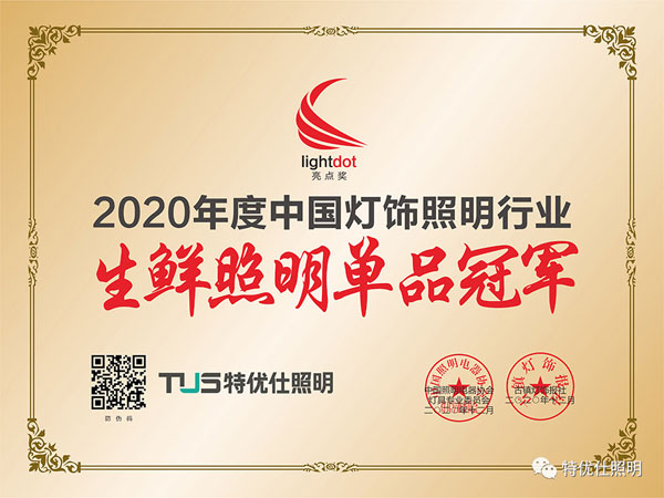 快訊 | 特優(yōu)仕照明榮獲2020年度中國(guó)照明燈飾行業(yè)“生鮮照明冠軍”!