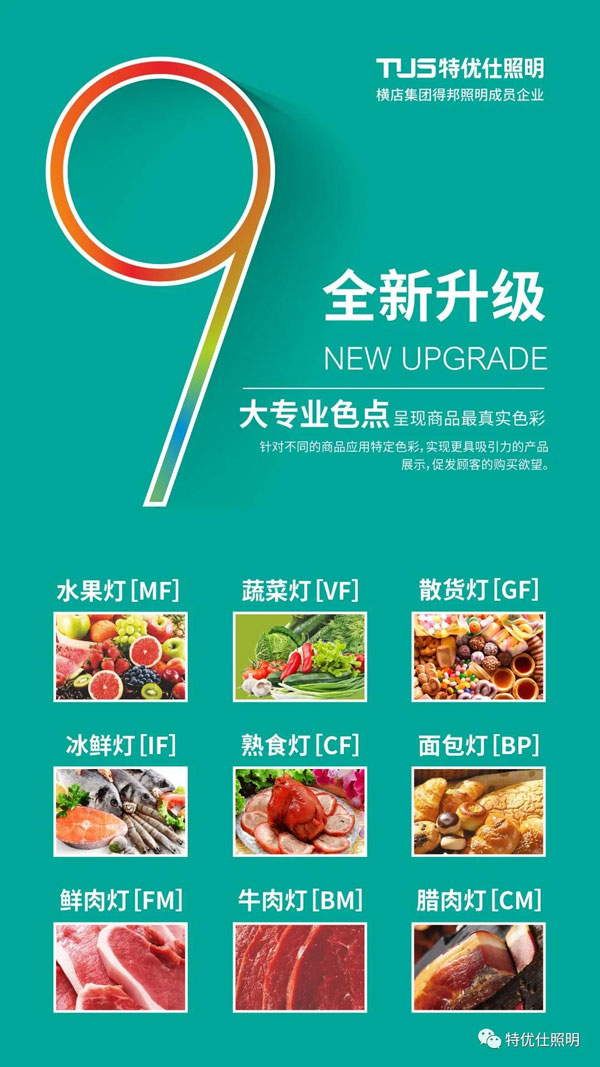 特優(yōu)仕照明首創(chuàng)行業(yè)生鮮照明9大專業(yè)色點(diǎn):水果燈[MF]、蔬菜燈[VF]、散貨燈[GF]、冰鮮燈[IF]、熟食燈[CF]、面包燈[BP]、鮮肉燈[FM]、牛肉燈[BM]、臘肉燈[CM];呈現(xiàn)不同商品最真實(shí)色彩,實(shí)現(xiàn)更具吸引力的產(chǎn)品展示,促發(fā)顧客的購(gòu)買欲望。